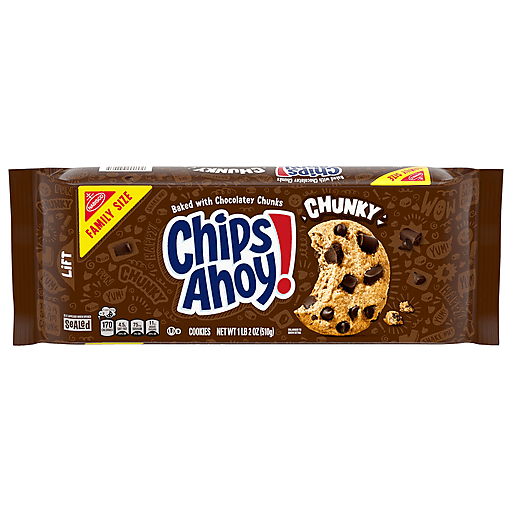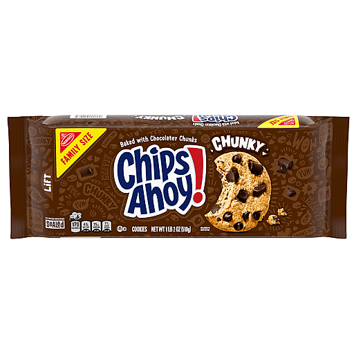 CHIPS AHOY! Chunky Chocolate Chip Cookies are the CHIPS AHOY! cookies you know and love, made with real chunks of chocolate and baked until perfectly crunchy. Enjoy the comforting taste of these chocolate chunk cookies that are sure to become a household favorite treat. Make lunches at school or work more exciting by including CHIPS AHOY! Chunky Chocolate Chip Cookies, or serve as birthday cookies at your next party. Regardless of the occasion, these crunchy cookies make a simply delicious treat or dessert. The lift tab makes this package of CHIPS AHOY! cookies easy to open and close for convenient storage.